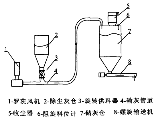 除塵系統(tǒng)手機(jī)的煙塵采用密閉管道正壓稀相輸送方式,將煙塵輸送到只求系統(tǒng)進(jìn)行壓球。采用氣力輸送的優(yōu)點(diǎn)是減少了煙塵的二次倒運(yùn)和因此產(chǎn)生的無組織排放,實(shí)現(xiàn)了煙塵的長(zhǎng)距離密閉輸送。如下圖: